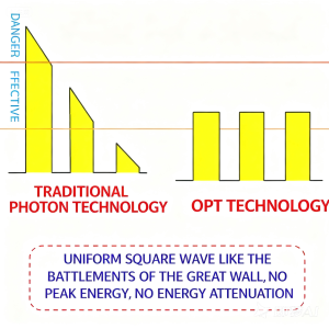 OPT is a technical term for the output waveform of Intense Pulsed Light (IPL). It achieves a uniform “square wave” distribution, eliminating the initial energy spikes of traditional IPL pulses (enhancing safety) and avoiding the energy attenuation at the end of traditional IPL pulses (improving efficacy).