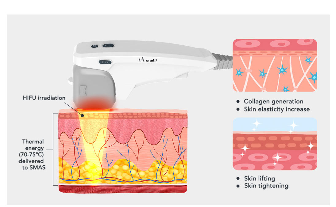 The HIFU machine uses high-intensity focused ultrasound to heat deep tissues in a way that the temperature of subcutaneous action can reach 60 ℃ - 75 ℃ and will not damage the skin surface.